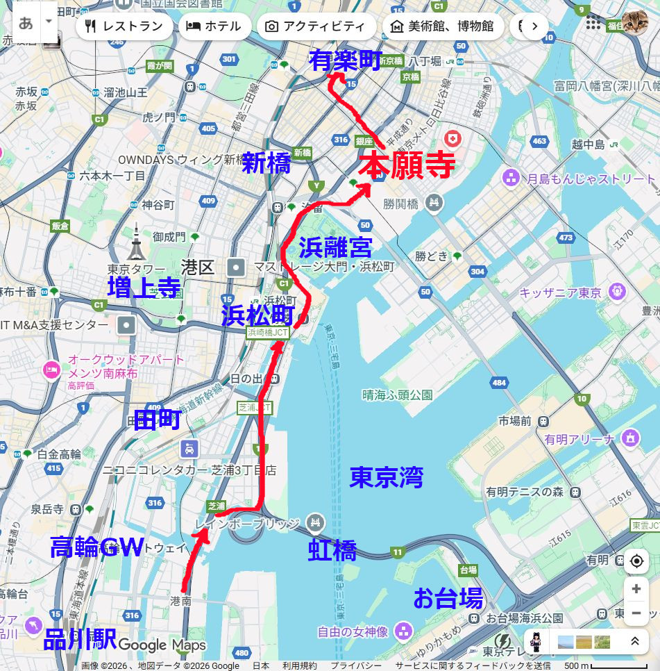 ▼031▼ゆりかもめの下を築地本願寺に向かって歩く